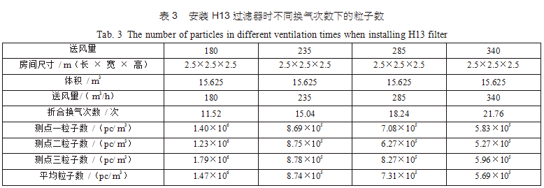 在空調(diào)機(jī)房中新建了三間2.5m×2.5m×2.5m的潔凈間,從空調(diào)主風(fēng)管引風(fēng),每支支管設(shè)置調(diào)節(jié) 閥,并設(shè)排風(fēng)機(jī)進(jìn)行全排,送回風(fēng)口及測(cè)點(diǎn)布置分別如圖 3(每點(diǎn)取樣三次,取平均值)。考慮到初中效過(guò)濾器對(duì)最后潔凈度的影響和最后理論塵埃數(shù)量 計(jì)算的方便,試驗(yàn)用初中效繼續(xù)分別為G4、F8,三個(gè)房間分別安裝高效過(guò)濾器,風(fēng)量500m3/h,第一組數(shù)據(jù)為送風(fēng)量按GMP 驗(yàn)證指南推薦換氣次數(shù)保持不變,分別用H12、H13、H14、U15過(guò)濾器,第二組數(shù)據(jù)為采用H13高效過(guò)濾器,調(diào)節(jié)風(fēng)量 ;第三組數(shù)據(jù)為采用H14高效過(guò)濾器,調(diào)節(jié)風(fēng)量,分別測(cè)得塵埃粒子數(shù),并列表得出不同的換氣次數(shù)下對(duì)應(yīng)的塵埃數(shù)如表2、表3、表4。